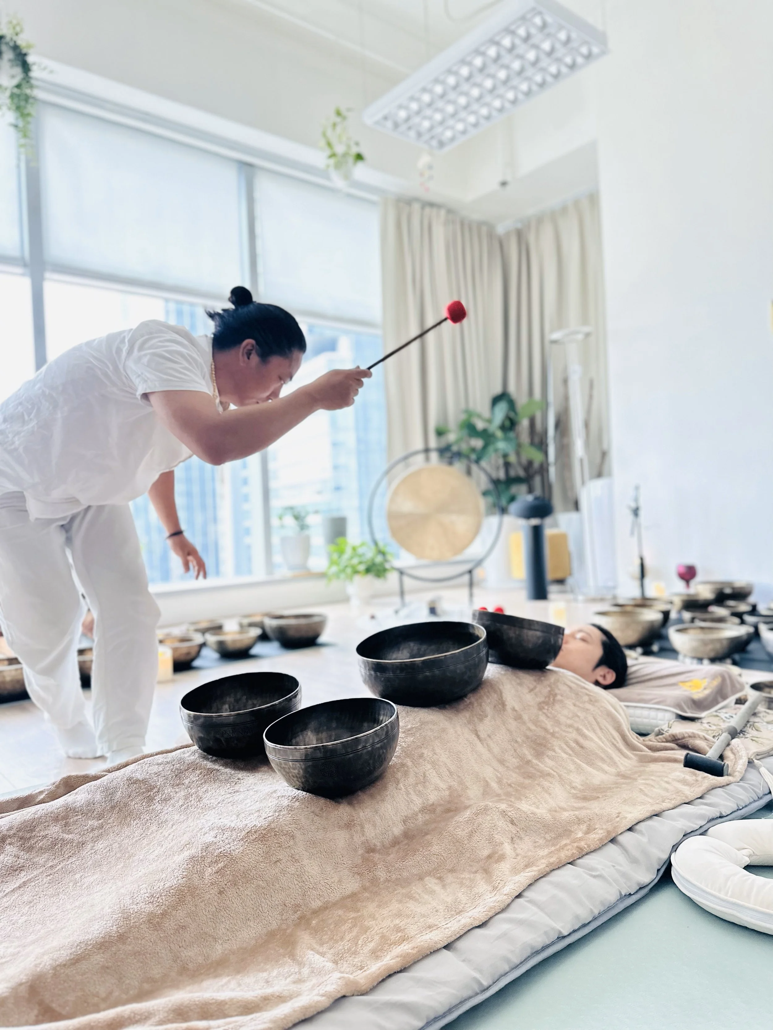 Our certificate workshops are accredited by the International Association of Therapists (IAOTH) and are widely recognized among wellness practitioners. Our distinctive training approach and generous sharing foster an environment where even beginners can connect with and confidently play singing bowls by the end of the workshops. Majority of our practitioners go on to integrate sound healing into their classes and offer private sessions to their communities after completing the advanced workshop training.